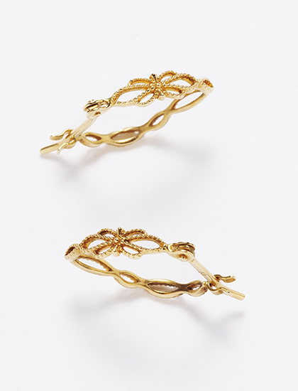 「控えめなフラワーモチーフ、華奢なボディとゴールドの上品な輝きは、華やかなのにきちんと感をキープ! オフィス用ジュエリーとしてもおすすめです。ほかのイヤーアクセサリーとも併用しやすいデザインで、コーデの幅が広がります」