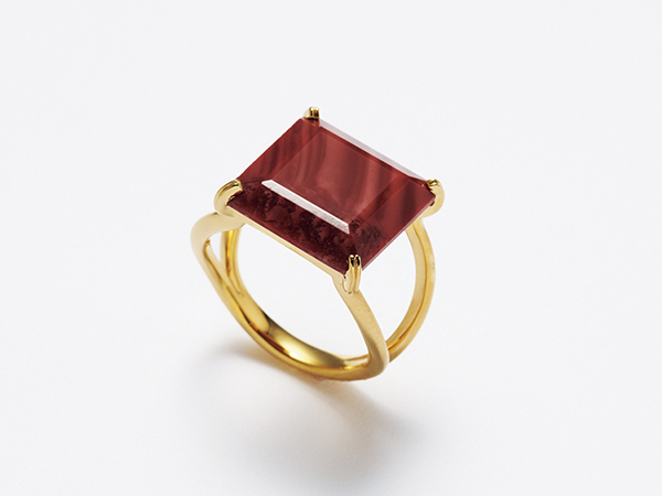 唯一無二の柄や色味が特徴の「レッドジャスパー」にタイルモチーフのオリジナルカットを施し、手元のアクセントになる大胆なサイズ感に。リング部分は抜け感のあるアームに仕上げ、ジェンダーレスに着用できるのもポイント。一期一会の出会いを大切に、天然石の魅力をたっぷりと楽しんで。
