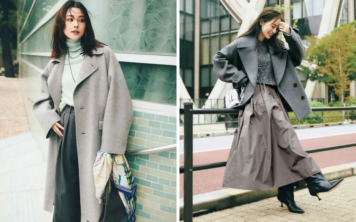 グレーのチェスターコートにスカートを合わせるときは、色や形よりも「コートとスカートの丈感のバランス」がポイント。スカート丈と同じかコートからほんのりスカートが見えるくらいの長さで合わせると、ブーツコーデのときもバランスよく着られます。