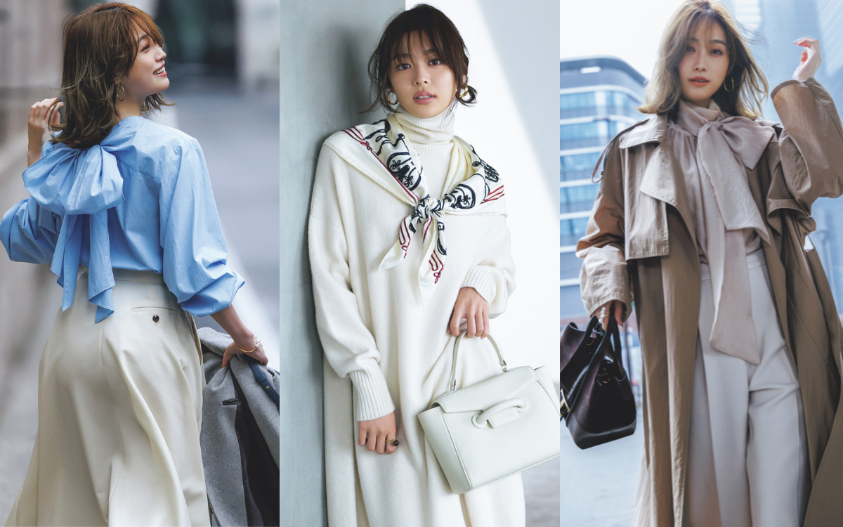 目を引くボウタイはロング丈のアウターからのぞかせるくらいがちょうどいい。1枚で決まるブラウスなら、コーデがサクッと組めて気分もアップ。〝アウターを脱いだら地味問題〟もこれで解決!