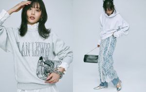大きめシルエットのロゴパーカを軸にまとめたリラックススタイル。カシミアファーのカーディガンやサテンのパンツなど、なめらかな肌触りのアイテムに身を包めば、おうち時間の幸せ度も上昇。