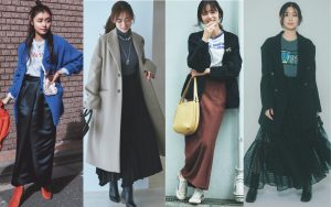 冬は分厚いコートやビッグシルエットのニットなど、大きなトップスでボリュームが出がち。そんなときは、ボトムスを黒のタイトスカートでまとめて、すっきりとしたIラインシルエットを意識してみて。
