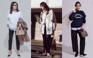 カジュアルな装いも、グレーとブルーの寒色同士なら品が漂う。ストライプ柄パンツやロングアウターで縦ラインをアピールすれば、ゆるっとした組み合わせでもすっきりクールな印象に着地。