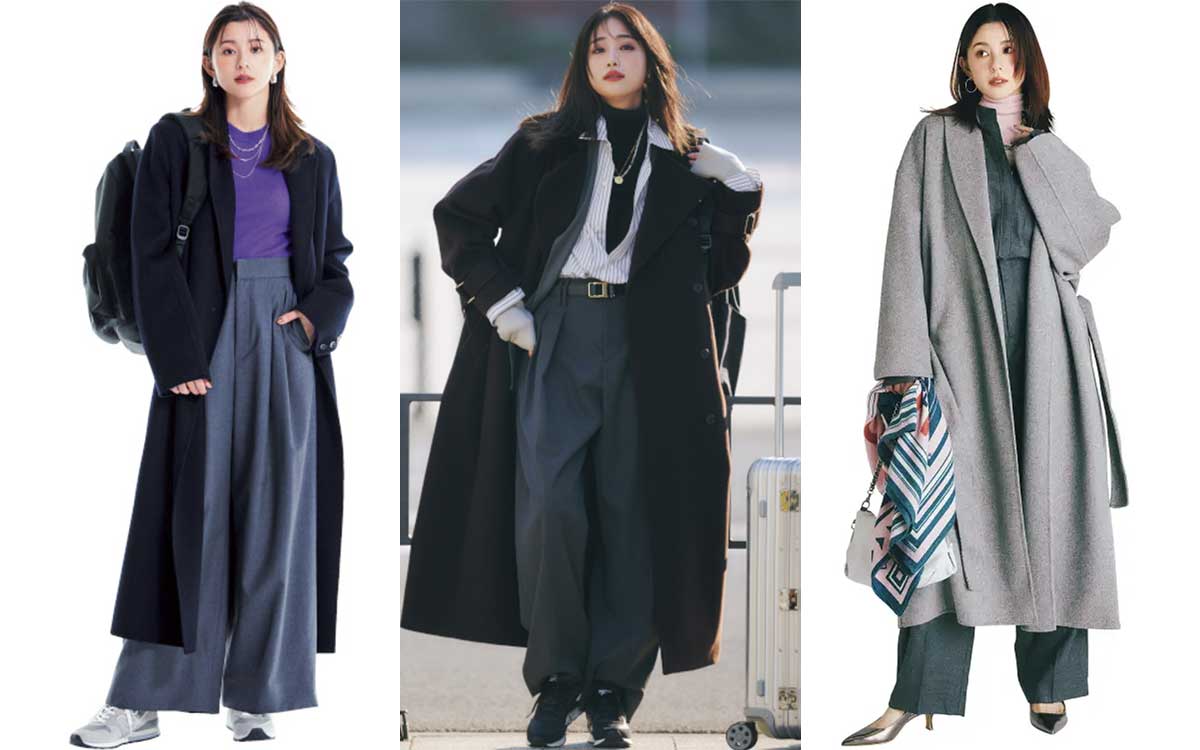 グレーワイドパンツとグレーロングコートの、色もシルエットも重めのコンビは、リュック合わせでキレよく軽快に。落ち着きあるコーデにアクティブなアクセントが加わる。