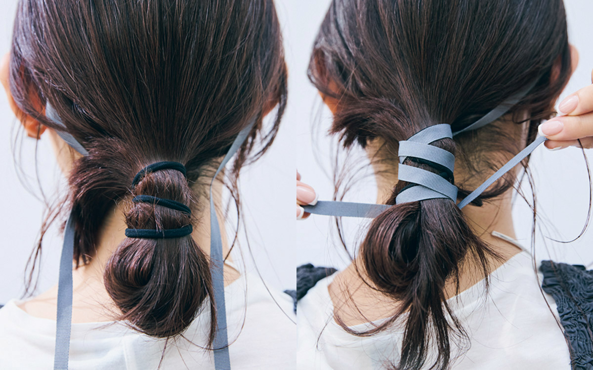 1. 太めのゴムで低めのポニーテールで結んでから、中間より毛先部分を結ぶ。