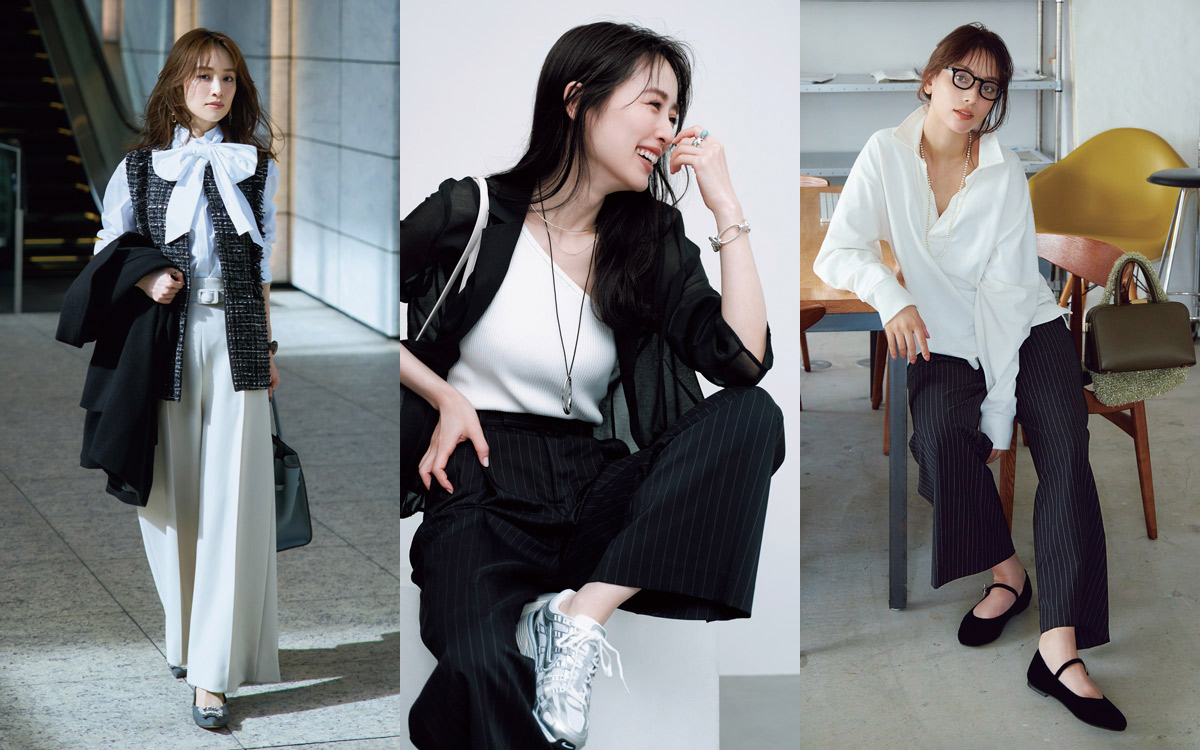 リッチ感のある素材やハリのあるシルエットでエレガントかつモダンな装いに。きれいめなセンタープレスのワイドパンツ、旬のツイードジレ、ボリュームのあるボウタイブラウス。どれも立体感のあるモノトーンなアイテムで、モードな雰囲気に傾けて意志の強さを感じさせたい。