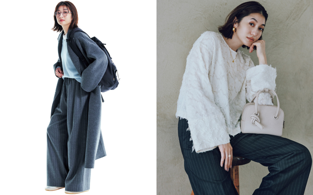 ニットやアウターで重く見えがちな秋冬コーデには、縦ラインを強調してくれるストライプパンツが好相性。すっきりとしたシルエットを生み、〝ほっこり感〟を防いでスタイリッシュに仕上がります。モノトーンやネイビーなどの落ち着いたトーンを選べば、大人っぽい上品さもキープ。立体感のある美シルエットでコーデをお洒落に導いて。