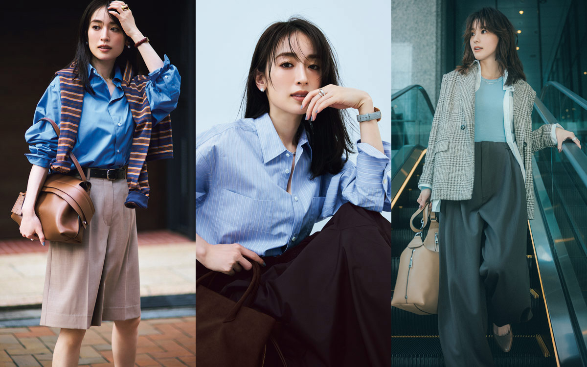 サックスブルーが鍵! きれいめリュクスな春先のオフィススタイル