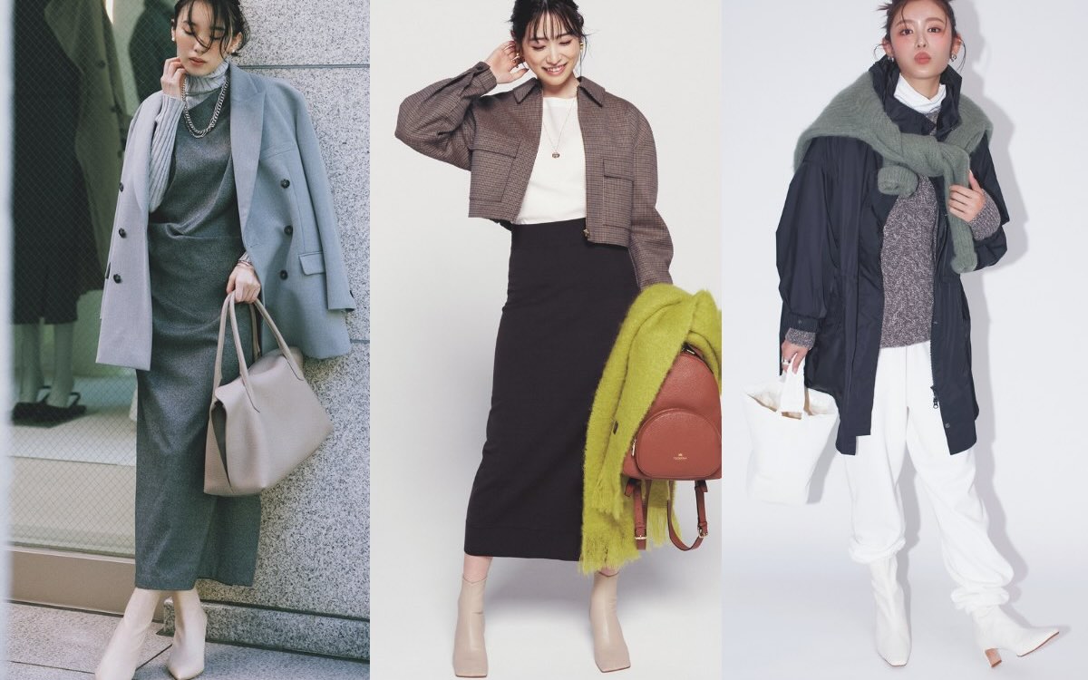 まずは、大人の品格を上げるスカートコーデから見ていきましょう。タイトスカートもフレアスカートも、白ブーツを合わせれば、よりきれいめな印象に。足首のくびれ感を活かしてすっきりとしたバランスにまとめて。