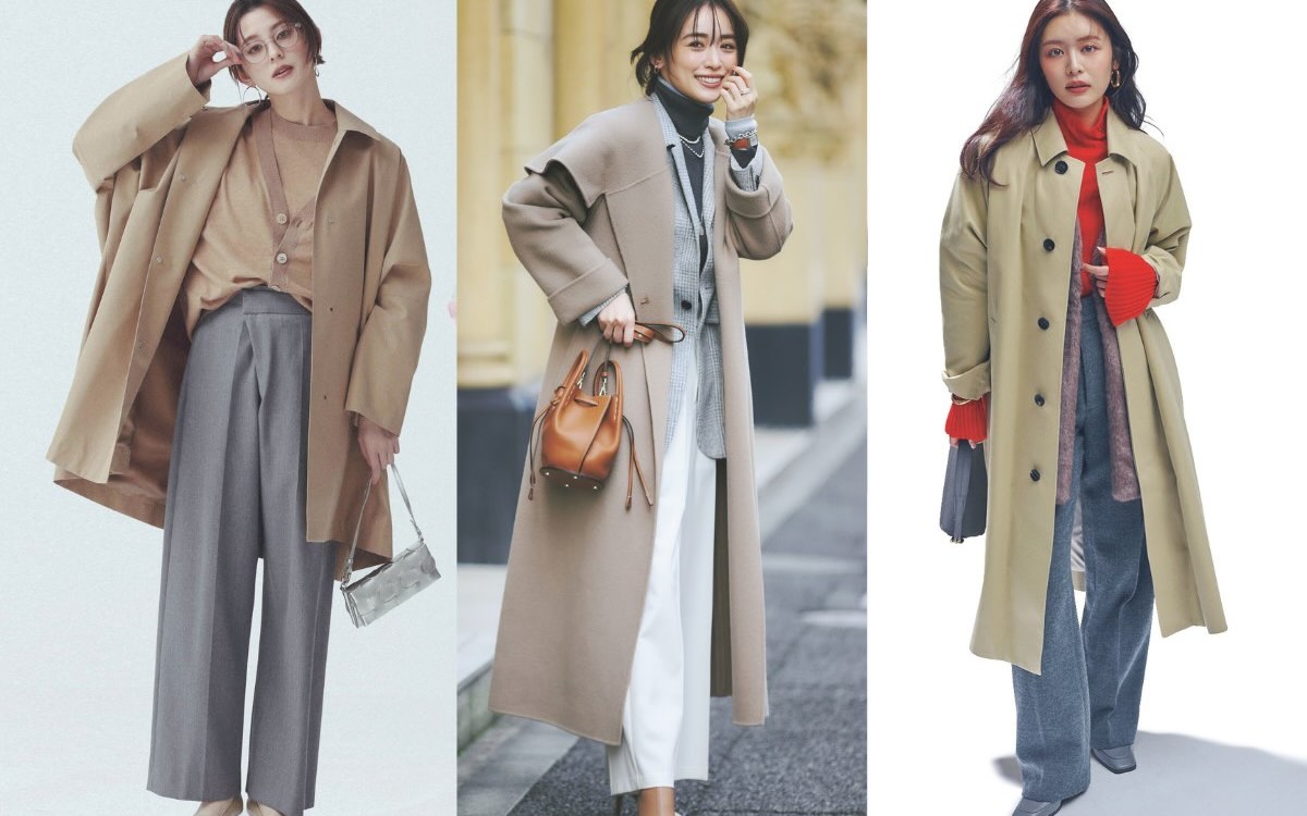 リッチ感と華やぎを備えたキャメルベージュと、クールな洗練が香るグレーは、ベーシックの一歩先をいく最旬配色。ツヤ感のあるコート&ニットが装いをエレガントにリードし、ラップパンツが全体をスタイリッシュに引き締める。