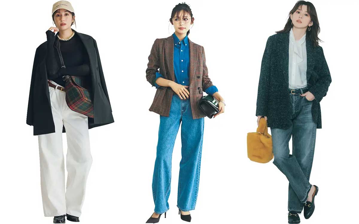 こっくりとした色味や厚手のアイテムが増える秋冬は、どうしてもほっこりとした印象にまとまりがち。すっきりと肩の力を抜いたこなれ感が欲しいときは、ジャケットスタイルをデニムで程よくカジュアルダウンしてみては? ジャケットやトップスの色や柄で季節感も演出してみて。