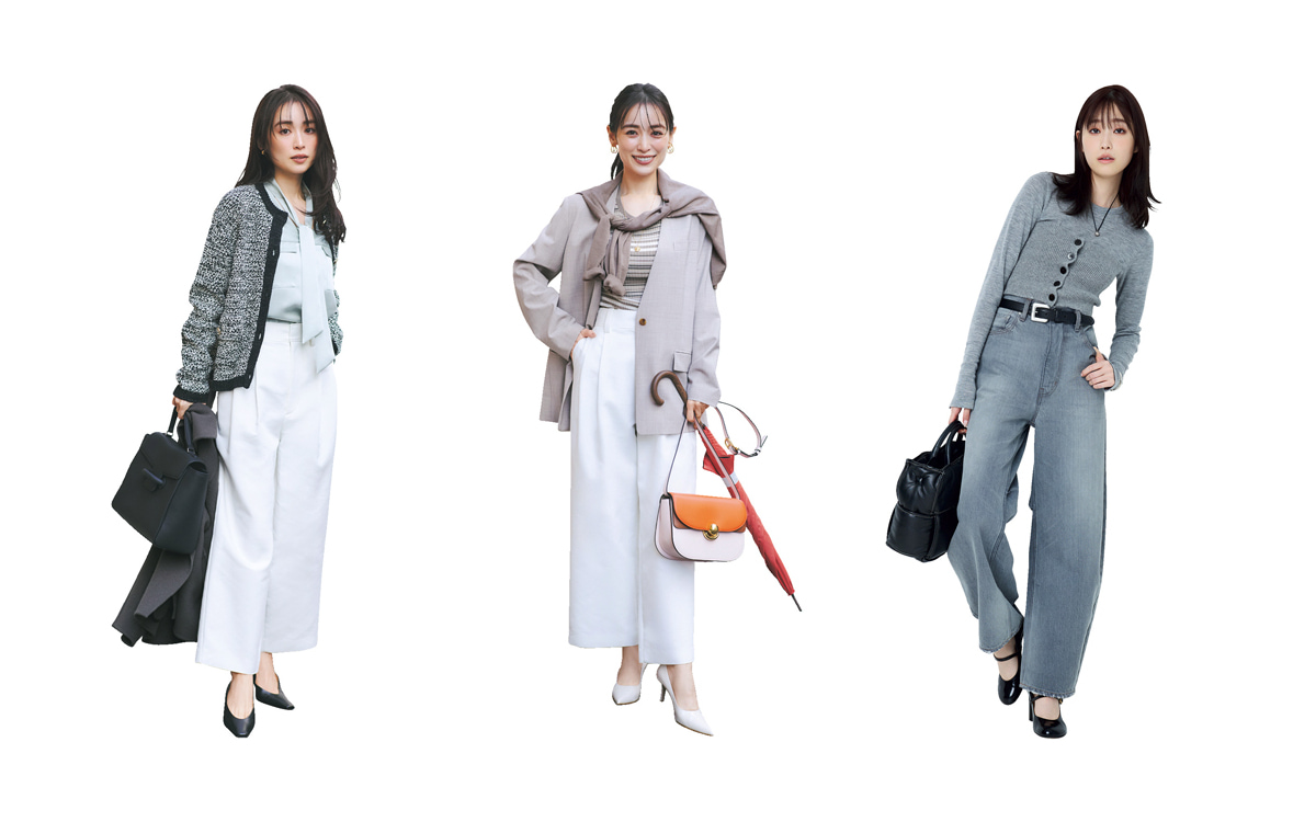 すっきりハイウエストだから女っぽさをキープ。ハンサムなグレーのワントーンで、あくまでもきれいめな仕上がりを目指して。