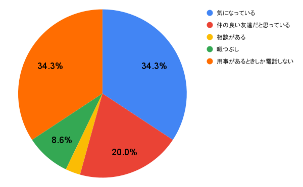 1位:「気になっている」…34.3%、同率1位:「用事があるときしか電話しない」…34.3%、2位:「仲のよい友達だと思っている」…20.0%、3位:「暇つぶし」…8.6%、4位:「相談がある」…1.7%