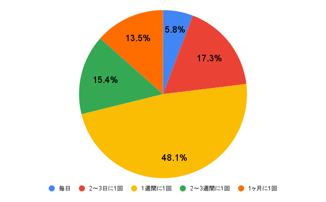 1位:「1週間に1回」…48.1%、2位:「2〜3日に1回」…17.3%、3位:「2〜3週間に1回」…15.4%、3位:「1ヶ月に1回」…13.5%、5位:「毎日」…1.7%