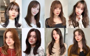 鎖骨ラインのミディアム。前髪は目にかかる長さで薄めに作り、フェイスラインに沿うようにレイヤーを入れます。毛先はセニング(すきばさみ)で軽く仕上げて。