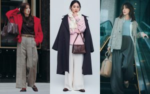 リッチ感と華やぎを備えたキャメルベージュと、クールな洗練が香るグレーは、ベーシックの一歩先をいく最旬配色。ツヤ感のあるコート&ニットが装いをエレガントにリードし、ラップパンツが全体をスタイリッシュに引き締める。