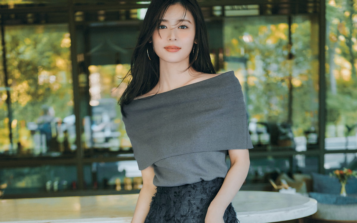 思い切り肩を露出した肌見せもよいですが、秋は首筋やデコルテがチラリと見えるくらいの控えめな肌見せが◎。すべてをさらけ出さないところが逆に色っぽく見えるはずです。とは言え肌を露出させる分、調整は必要。配色やボトムスで辛口要素を加え、ヘルシーに振ってあげるのが上手な着こなしのコツ!