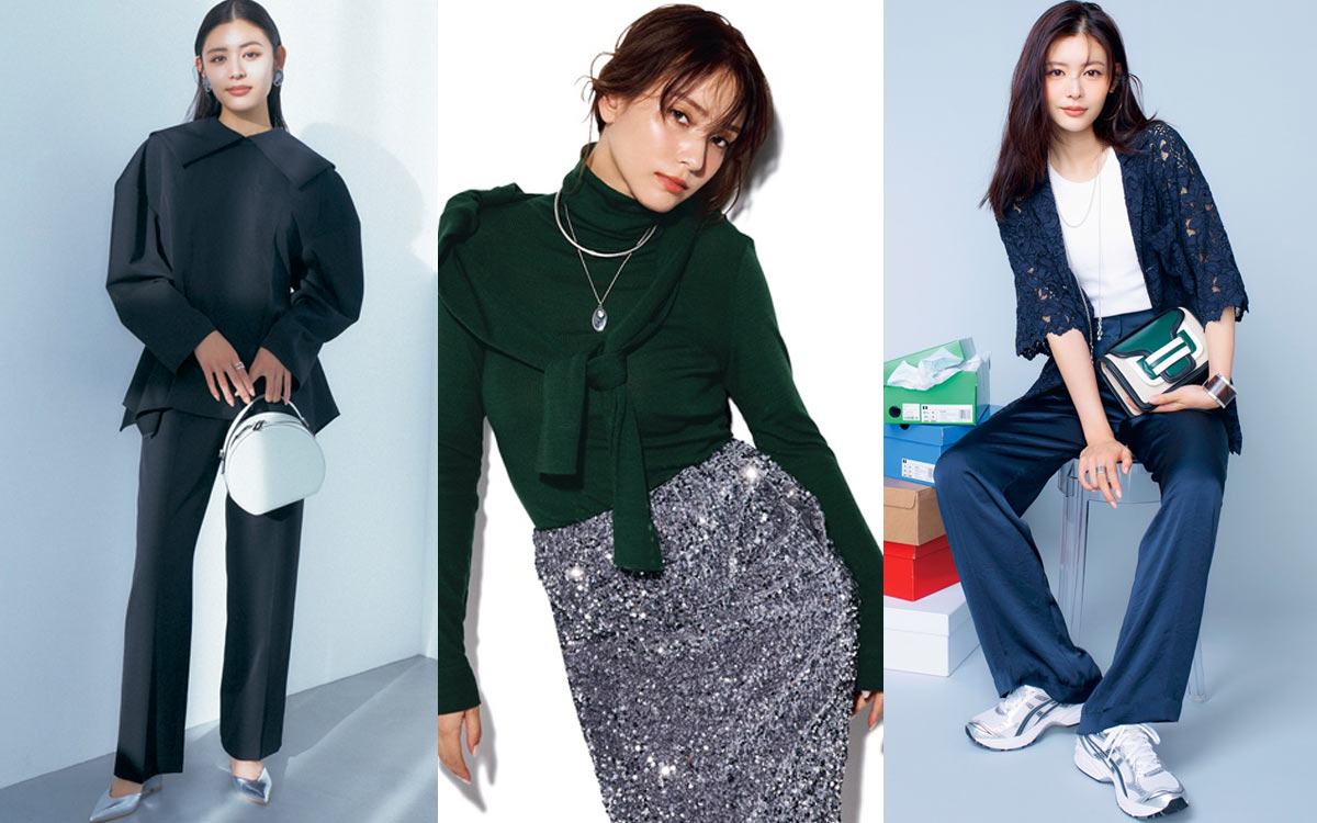 効きのいい華やかな素材のニットアイテムは大人コーデのスパイスに。落ち感のあるワイドなシルエットならトレンドライクな着こなしに。