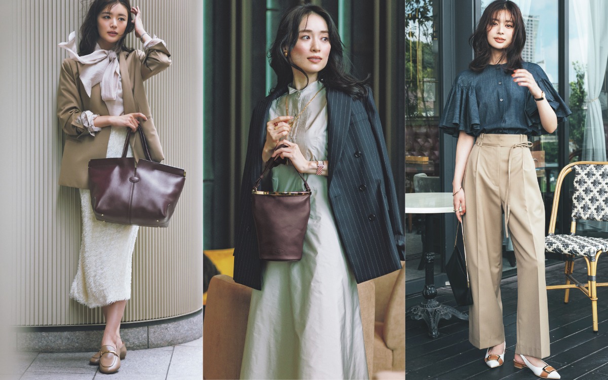 ふだんはオフィスコードが緩めな内勤派も、クライアント訪問の日はジャケットを中心にきちんとした装いが必須。とはいえ大きめサイズのバッグでも今っぽく! が本音。深みのある新色&カッティングのアクセントで他と一線を画して、おしゃれ気分を満たしたい。