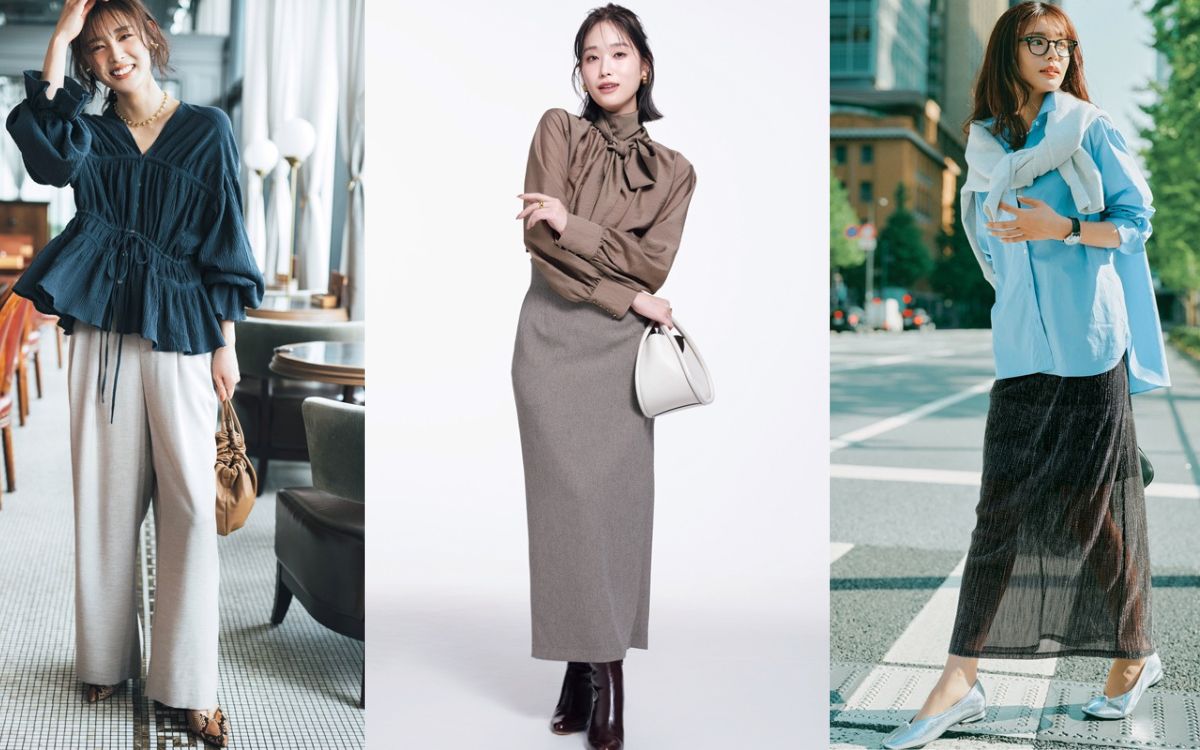 秋らしいクラシカルなムードが漂う、胸元フリル×ボウタイデザインのブラウスが主役。あえてメンズライクな太パンツを合わせてブラウスをドレスダウンすると、デイリーに取り入れやすい。