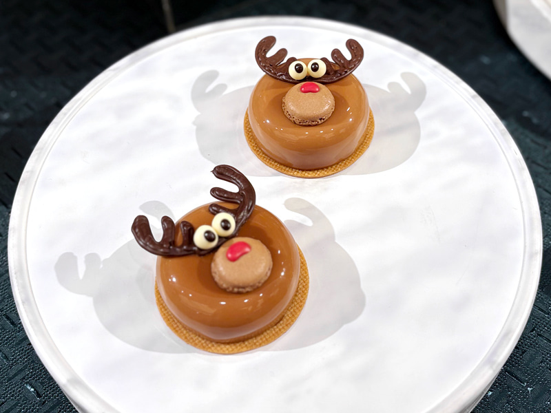 新作三つ目は、クリスマス時期の手土産で喜ばれそうな「赤鼻のトナカイ」。よく見るとトナカイ一つ一つの顔の表情が少しずつ違う、愛嬌たっぷりの「赤鼻のトナカイ」は、見た瞬間に笑みがこぼれる小さなケーキです。シュクレにビスキュイショコラを重ね、その上にバニラクリーム、粒々食感が楽しいミックスベリーのコンフィチュールが隠れ、チョコレートムースに覆われています。ひと口ごとに表情が変わるような奥行きを感じる味わいは、子どもから大人まで虜にするほどの美味しさです。アルコールフリーなので、子どもから大人まで一緒に楽しめるのも嬉しいポイント。