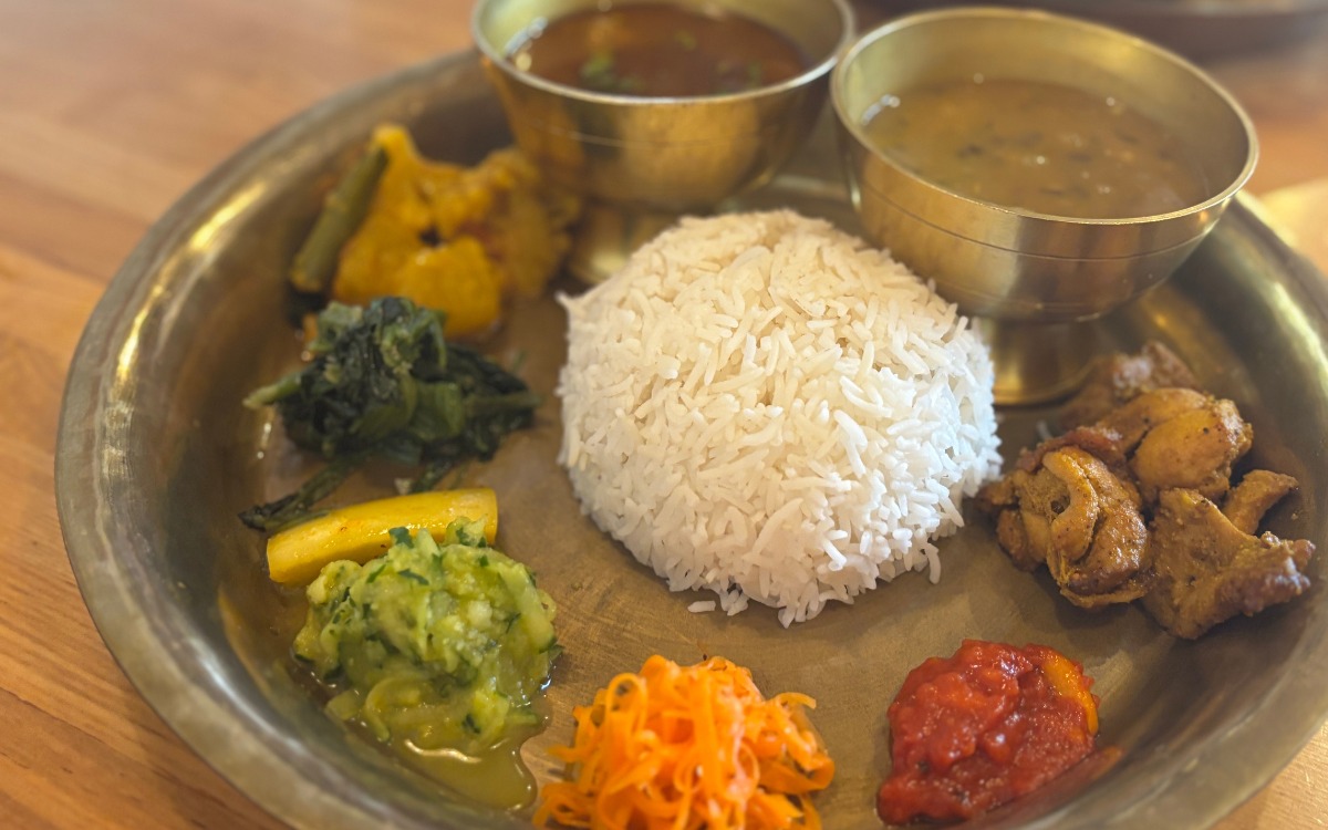 私がいつもオーダーするのはネパールの家庭料理という「ダルバート」。チキン、マトン、ベジタブルの3種類あり、すべて食べましたが、個人的推しはマトンです。奥の足がついた器、左がマトンカレーで、右が豆のカレー。まわりには手作りの野菜のおかずが5~6種類。さらにグリルしたチキンもON。右斜め下のトマトのチャツネがいい仕事をしてくれて、好きです。