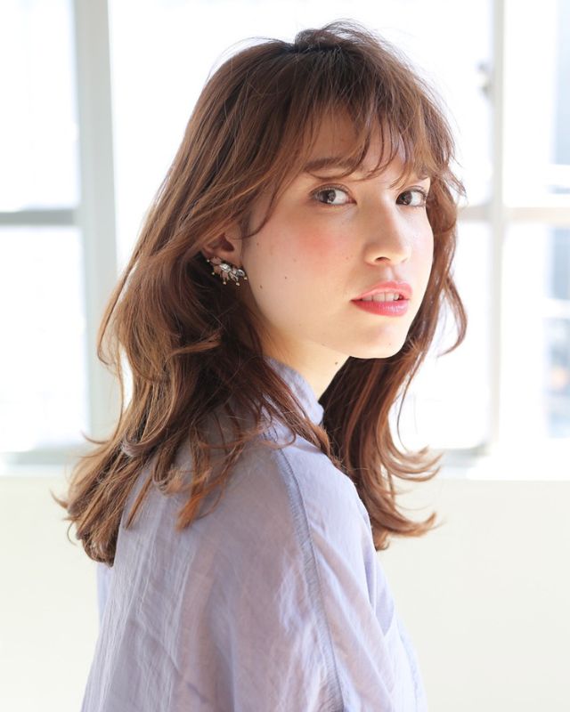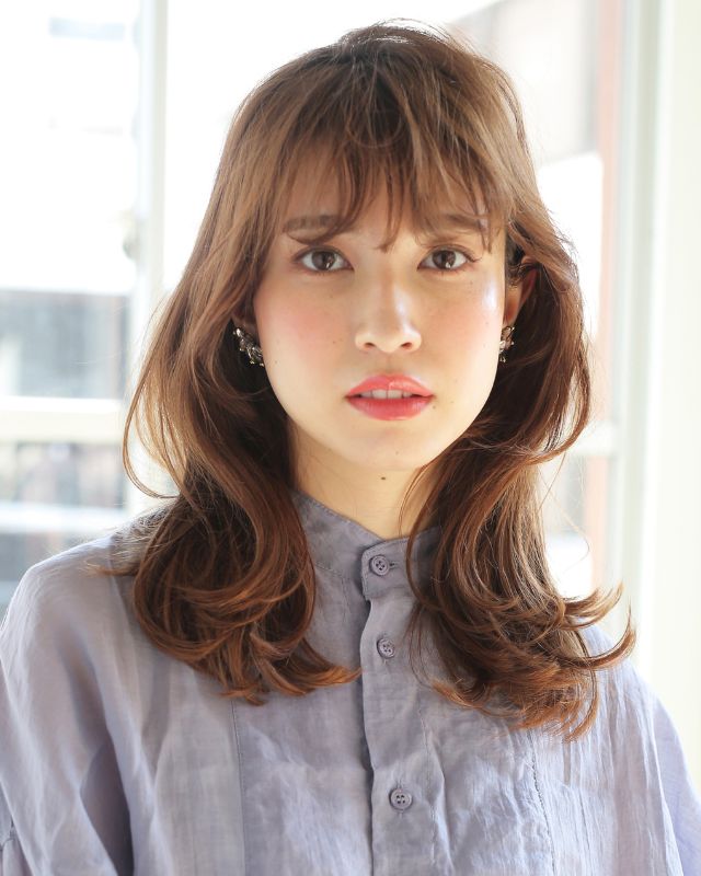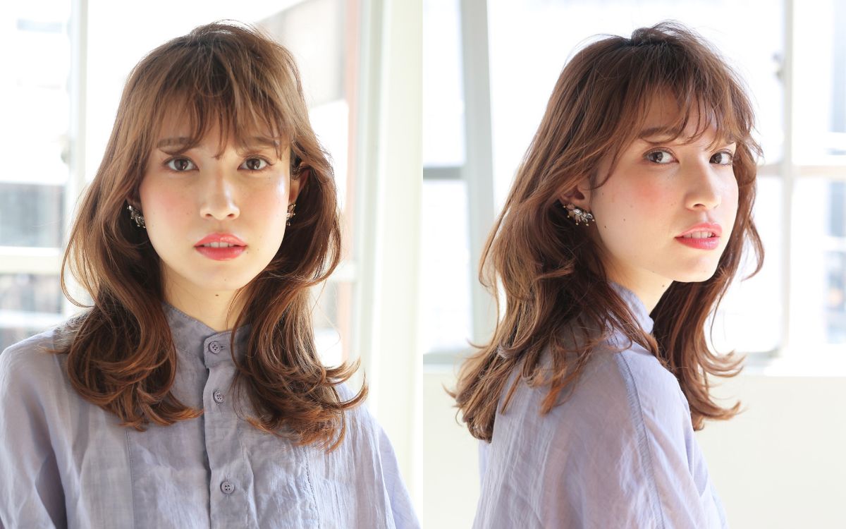 カットベースを鎖骨下5cmで切り、表面にレイヤーを入れます。前髪は目元ギリギリの長さでやや厚めに。パーマで抜け感や動きを出せるため、厚めに作ってスタイリングで軽く見せます。顔周りのニュアンスとなるおくれ毛をあごラインでカット。