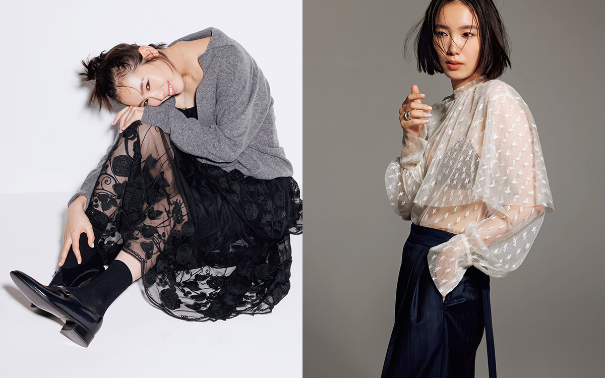 白のレース、かつチュールベースの繊細さを極めた透け感。なのにその印象はけっして甘くない、稀有なバランスのブラウス。ストイックなスタンドカラーとケープ状のレイヤードが、エレガントな素材感をモードでドラマティックな存在感へと引き上げる。マニッシュなネイビーのパンツと重厚なリングで、ぐっと硬派に着こなしたい。ブラウス¥37,400(オンワード樫山 お客様相談室〈BEIGE,〉) パンツ¥66,000(トゥモローランド 渋谷本店〈トゥモローランド ビー〉) リング[2個セット]¥21,780(ZUTTOHOLIC〈バルブス〉) 中に着たブラ/スタイリスト私物