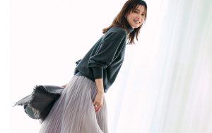 ニット¥14,300(TOMORROWLAND〈MACPHEE〉) スカート¥60,500(デパリエ ニュウマン新宿店〈デパリエ〉) バッグ¥113,300(ピエール アルディ 東京〈ピエール アルディ〉) 靴¥80,300(カチム) ストール¥35,200(アルアバイル〈アソースメレ〉) ネックレス[短]¥33,000(フォーティーン ショールーム〈ミチ ウィルウェイ〉) ネックレス[長]¥28,600(ZUTTOHOLIC〈アドラル〉) バングル¥36,300(ソワリー)