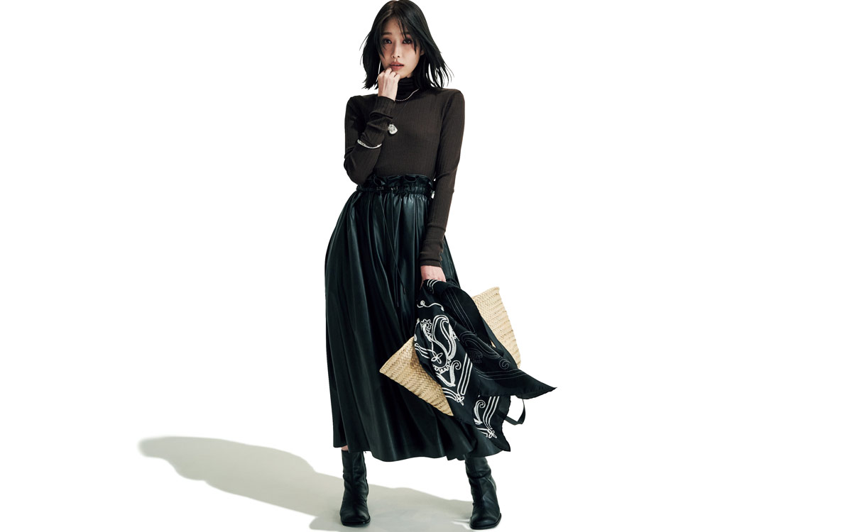 インパクト大なレザースカートはモノトーンに逃げたくなるところを、あえてのダークブラウン合わせで、新鮮な着こなしに。