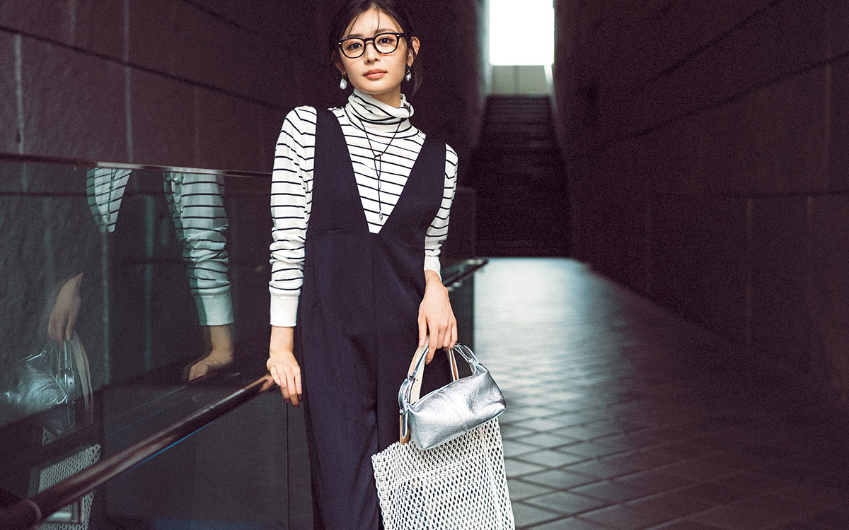 バッグ[小]¥125,400(J&M デヴィッドソン カスタマーセンター〈J&M デヴィッドソン〉) バッグ[大]¥19,800(メアリ オル ターナ) サロペット¥59,400(DES PRÉS〈DES PRÉS〉) ニット¥27,500(トラディショナル ウェザーウェア 渋谷店〈トラディショナル ウェザーウェア〉) 靴¥19,800(ル タロン グリーズ ルミネ新宿店〈ル タロン グリーズ〉) メガネ¥46,200(アイヴァン 東京ギャラリー〈アイヴァン〉) ピアス¥62,700(リューク) ネックレス¥9,900(フーブス〈IRIS 47〉)