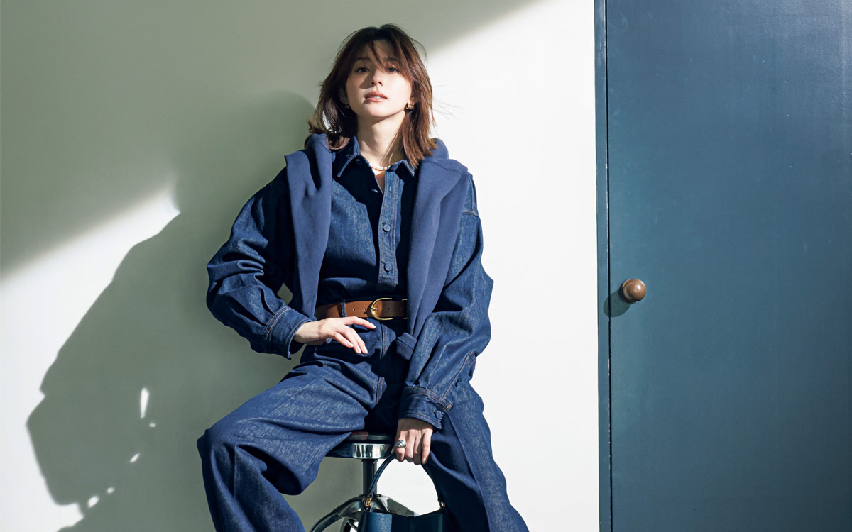 デニムシャツ¥32,780・デニムパンツ¥31,900(ADORE〈SERGE〉) 肩に掛けた〝Y〟のスウェット¥19,800・〝イレーヴ〟のネックレス¥35,200(イレーヴ) バッグ¥270,600(トッズ・ジャパン〈トッズ〉) 靴¥64,900(アマン〈ペリーコ〉) ベルト¥29,700(アロー) ピアス¥30,800(スクア〈スクア〉) リング¥35,200(ヴァンドームヤマダ〈エルエーエイチ〉)