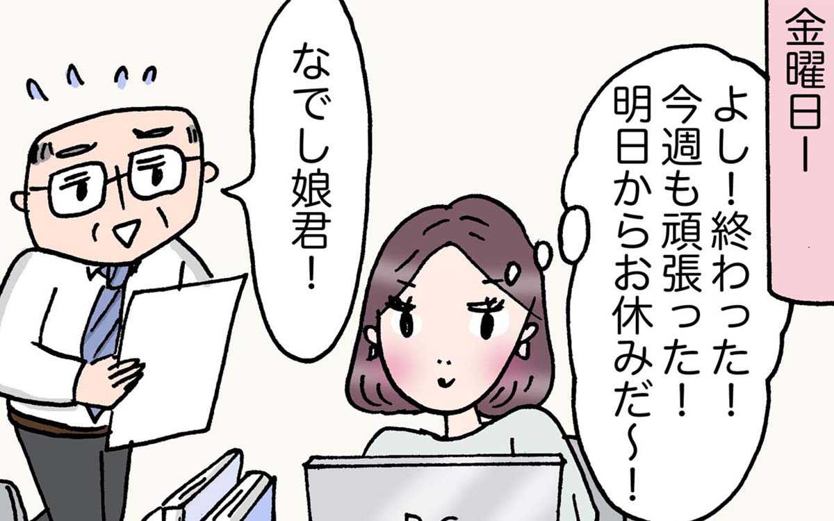 1週間の仕事を終えた、金曜日の夕方。「明日から休みだ!」とウキウキのなでし娘ちゃん。