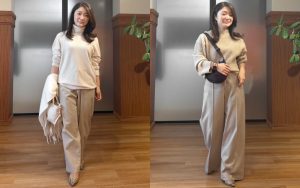 中に着たニットも今期のUNIQLO and JW ANDERSONのもの。ピンク、ベージュ、オリーブの3色展開で、私はベージュを着てみました。フェアアイル柄というそうですが、ほっこりしているだけでなく洗練された配色と短め丈が素敵です。すっかり定番になったカーブパンツもゆったりとしたシルエットが今どきだなと思いました。