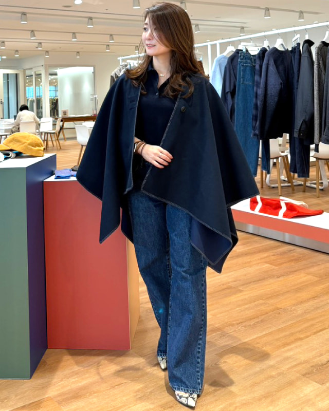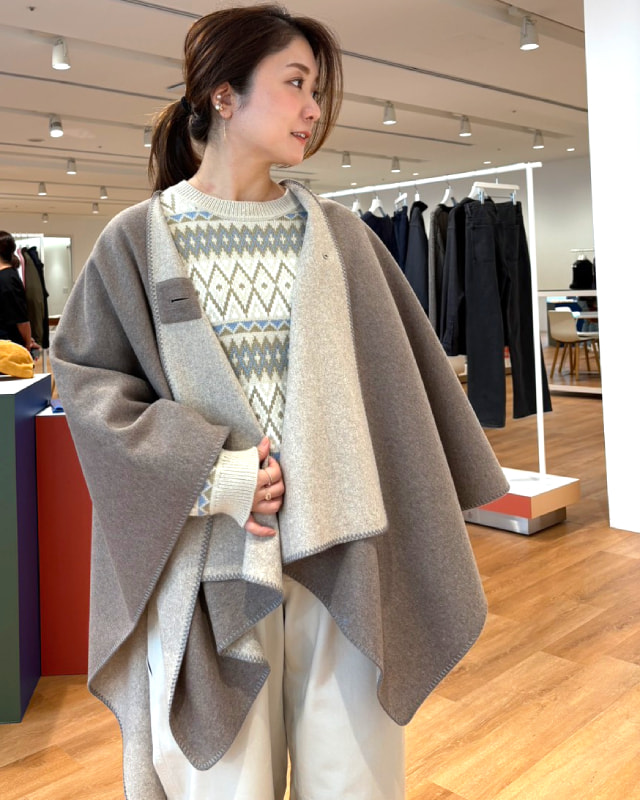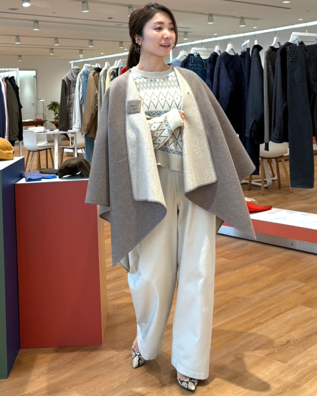 ステッチが効いて可愛い。着るというよりは、サラッと羽織ってボタンで留めるだけ、という気軽なアウターです。ボタンを外して羽織るのも良いし、着ない時はブランケットとして使う事もできます。休日スタイルにはもちろん、通勤スタイルがカジュアルめでもOKな方や、車移動生活が多く分厚いアウターは不要な方などにもいいですよね!