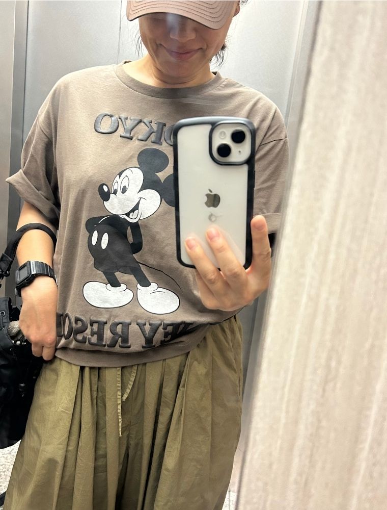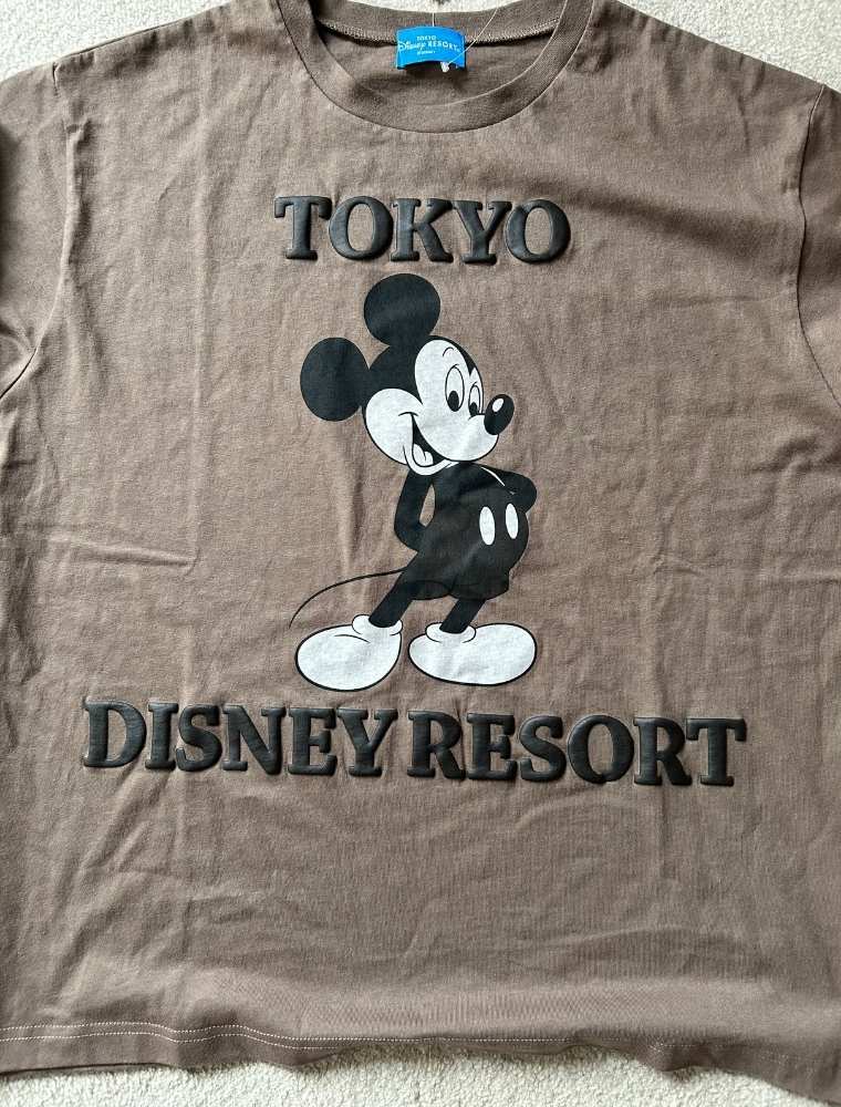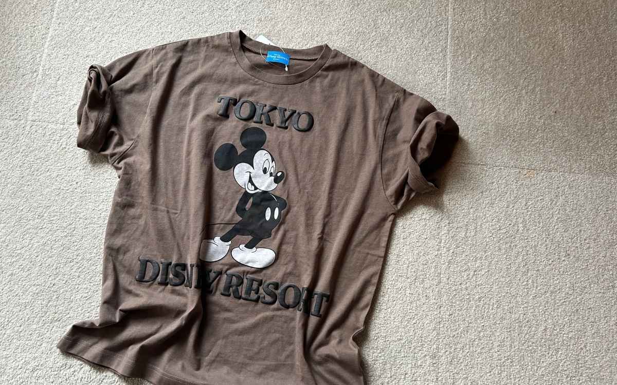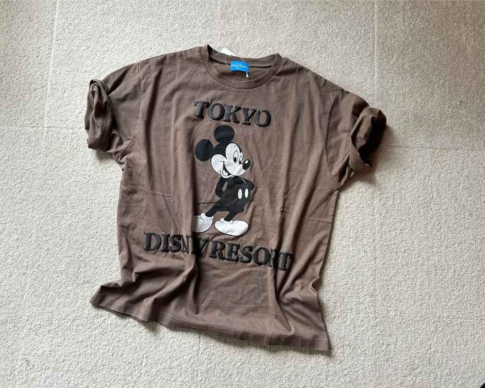 ここには何種類ものTシャツやパーカがあって、もちろんどれもかわいいんですけど、大人っぽくてデイリーに着られるデザインを探し当てるのが私の楽しみ。そして今回も、超ツボなTシャツに出会えまして♡ こちらのブラウン生地のミッキーT、トレンドのドライな渋〜い茶色がとびきり大人っぼく、見つけた瞬間これだ!と心を奪われました。