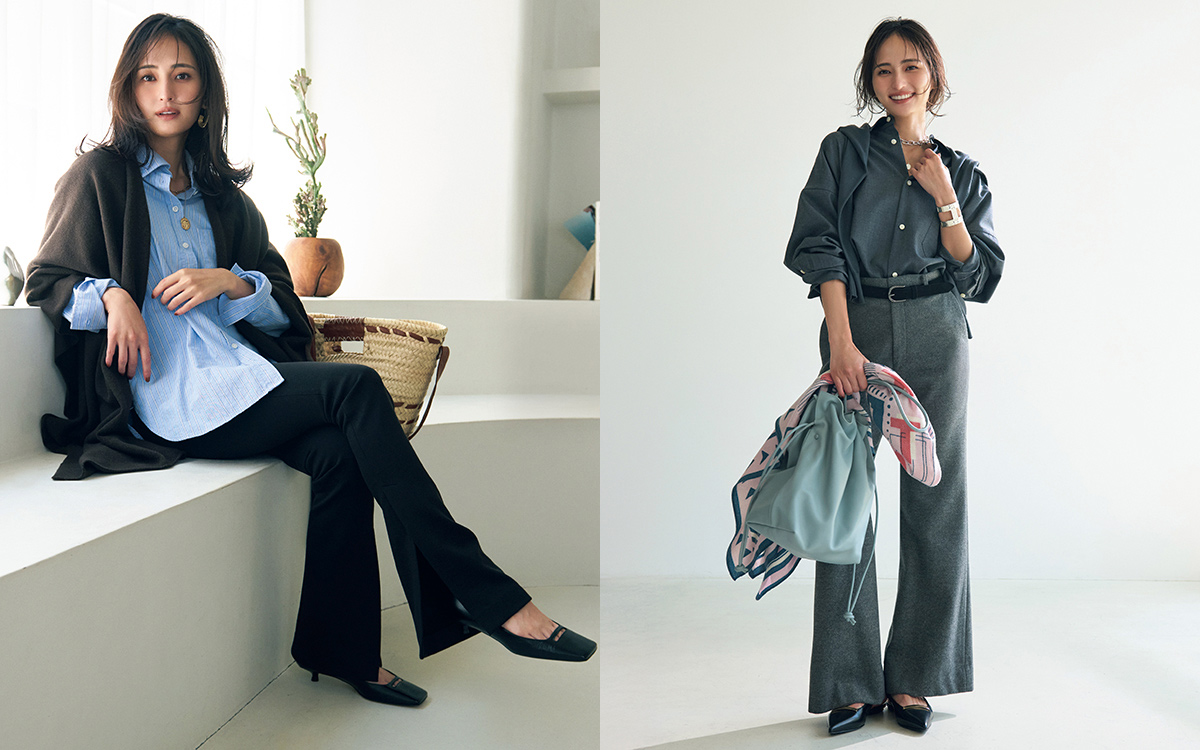 スリットが入ることで軽やかな仕上がりのセミフレア。重ね着で重心が上がるこれからの季節も、より軽快な着こなしに着地できる。このバランスが今っぽい! パンツ¥40,150(ユナイテッドアローズ 渋谷スクランブルスクエア店〈レハ〉) シャツ¥9,990(Gap) バッグ¥15,400(The Edit store〈KECH LeS ESSENTIELS〉) 靴¥64,900(アマン〈ペリーコ〉) ストール¥41,800(ドゥーズィエム クラス 青山店〈ドゥーズィエム クラス〉) ピアス¥13,200(chibi jewels JAPAN〈chibi jewels〉) ネックレス[短]¥23,100(八木通商〈ローラ ロンバルディ〉) ネックレス[長]¥13,200(フーブス〈IRIS47〉)