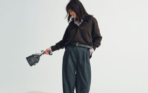 パンツ¥22,000(LE PHIL NEWoMan 新宿店〈LE PHIL〉) ニット¥44,000(Theory) ブラウス¥35,200(DES PRÉS〈DES PRÉS〉) バッグ¥90,200(ヤマニ〈メゾン カナウ〉) 靴¥39,600(PIPPICHIC) ピアス¥29,700(フーブス〈IRIS47〉) ネックレス¥16,500(エルディスト ショールーム〈ジャミレイ〉) リング¥21,120(ZUTTOHOLIC〈バルブス〉)