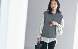 ジレ¥61,600・パンツ¥50,600(LITTLE LEAGUE INC.〈ユニオン ランチ〉) カットソー¥12,100(yori) バッグ¥17,380(ジオン商事〈セピカ〉) バッグに付けたスカーフ¥22,000(マニプリ) 靴¥156,200(J.M. WESTON 青山店〈J.M. WESTON〉) ピアス¥23,100(プラス ヴァンドーム) ネックレス¥51,700(ヴァンドームヤマダ〈LAH〉) 〝プチ・モーメント〟のバングル¥9,900・〝バルブス〟のリング¥27,500(ZUTTOHOLIC)