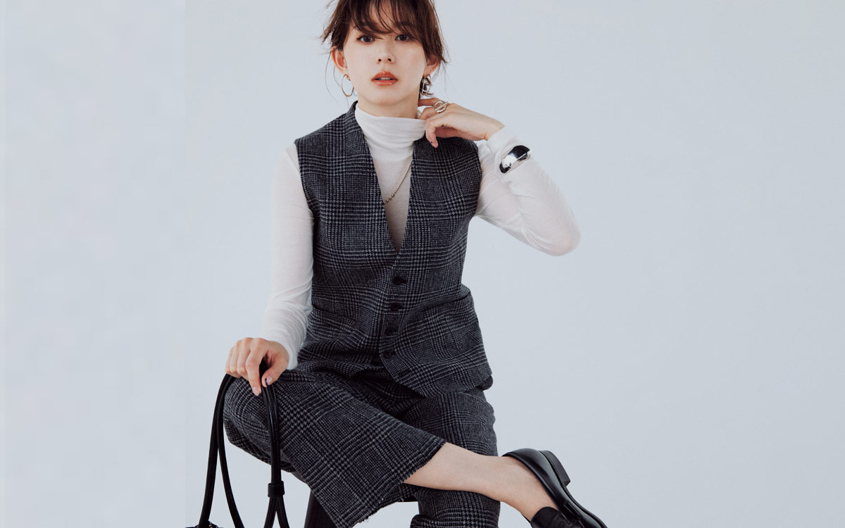 トレンドの襟なしタイプのジレは、知的でありながら肩の力が抜けた印象。さらに、グレンチェック柄&ショート丈ジレのセットアップなら、メンズ的な粋も漂う。インは白のシアータートルで軽やかに。