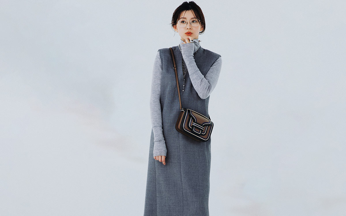 ワンピースとしても着られるロングジレ×ワイドシルエットのパンツなら「おしゃれ上手」感を簡単にゲット。全体をグレーのワントーンでまとめて、品のよさも抜かりなく。