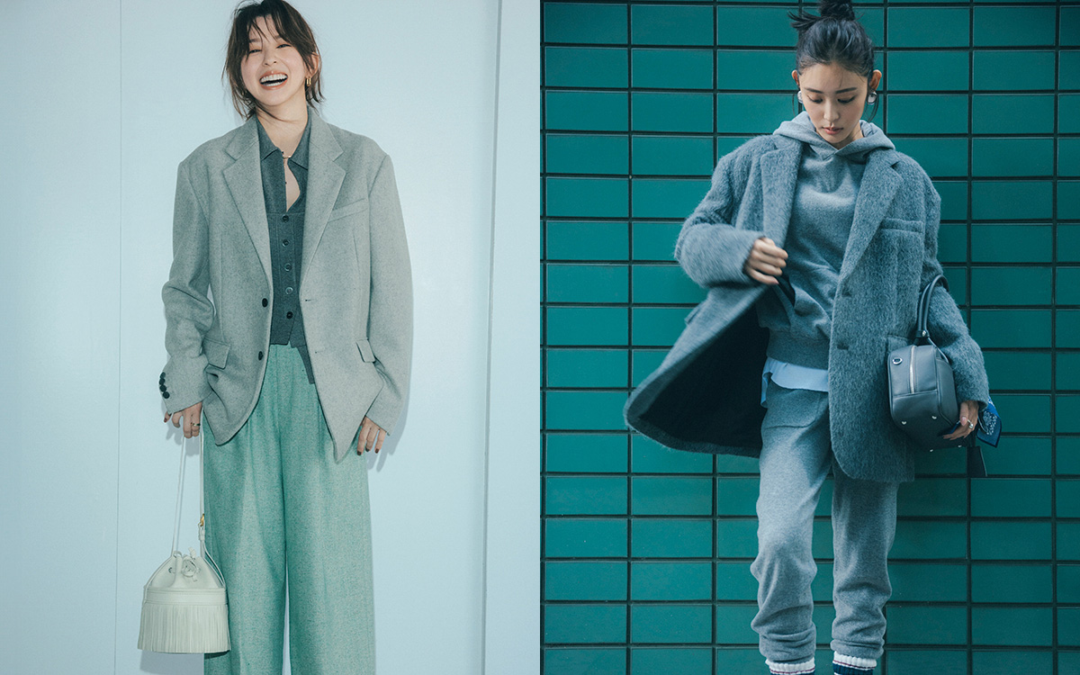 ポイントで挟んだ白のカットソーやソックスが、グレーのワントーンコーデをうまくつないでくれる。ジャケット¥53,900(エディション 表参道ヒルズ店〈Edition〉) ニット¥63,800・パンツ¥55,000(オットデザイン〈ルームエイト〉) カットソー¥30,800(ボウルズ〈ハイク〉) バッグ[チャーム付き]¥24,200(ルーニィ) 靴¥11,000(ワールド プレスインフォメーション〈デッサン〉) バッグに巻いたバンダナ¥1,650(Shinzone LUMINE YURAKUCHO〈THE SHINZONE〉) ピアス¥52,800(オブリオ〈カミーユスロ〉) リング¥26,400(PLOW) ソックス¥3,520(バロックジャパンリミテッド〈トウキョウ ウィークリー ジャーナル〉)
