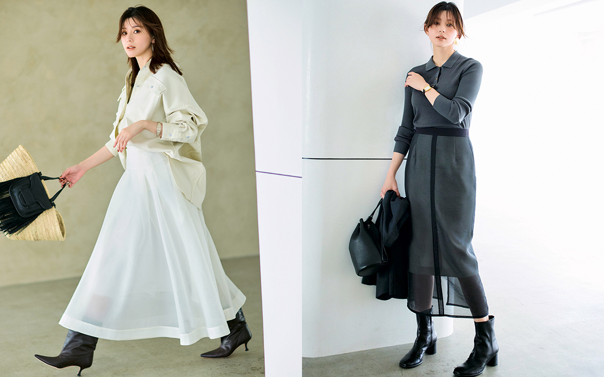 もしもこれがロングブーツだったら、膝下の素肌が透けずに、今より重たい印象に見えたはず…。薄手のシアースカートを安定感よく引き締めながら、透け感を軽やかに楽しめるのはショートブーツならではのメリット。スカートは、オフホワイトのタイトに黒のシアー素材を重ねたコントラストが目をひいて。スカート¥26,400(アルアバイル) 靴[6]¥47,300(伊勢丹新宿本店 本館2階 婦人靴〈ファビオ ルスコーニ〉) ニット¥28,600(LITTLE LEAGUE INC.〈エブール〉) 手に持ったジャケット¥86,900・ピアス[片耳価格]¥35,200(イレーヴ〈イレーヴ〉) バッグ¥47,300(SUPER A MARKET AOYAMA〈AETA〉) 時計¥17,600(クルース)