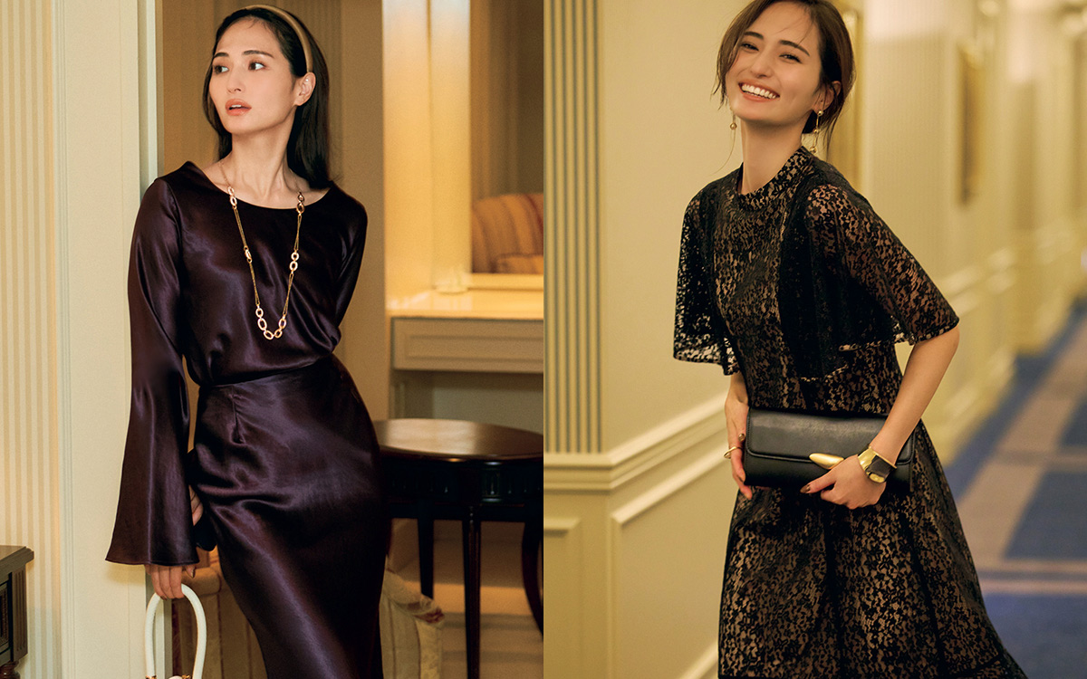 黒の総レースと光沢のあるべージュの2枚仕立てのドレスは、リッチなコントラストに。王道なシルエットだからこそ、大ぶりなゴールドのアクセサリーでモードに振って。ワンピース¥41,800(フランドルカスタマーサービス〈エフデ ブラック〉) バッグ¥59,400(アマン〈マエストソ〉) ピアス¥10,120(ZUTTOHOLIC〈プチ・モーメント〉) バングル¥11,550(フォーティーン ショールーム〈エイチアッシュ〉) リング¥35,200(ヴァンドームヤマダ〈ケンゴ クマ プラス マユ〉)