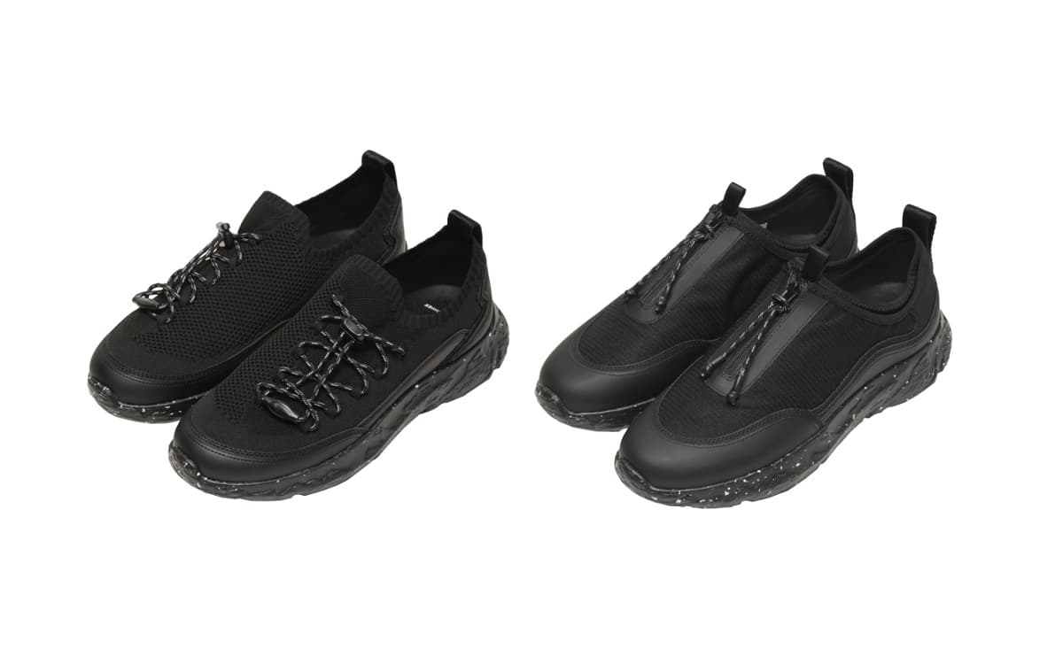 今回登場した注目モデルのひとつ「ブラックメテオニットSXL」は、テックニットアッパーに斜めに配したシューレースが象徴的なデザイン。撥水加工を施したメッシュニットとTPUマッドガードを組み合わせた防水性の高い構造で、急な雨にも対応します。また、リフレクター仕様のシューレースにはコードロックを搭載し、ストリート感と利便性を両立させました。