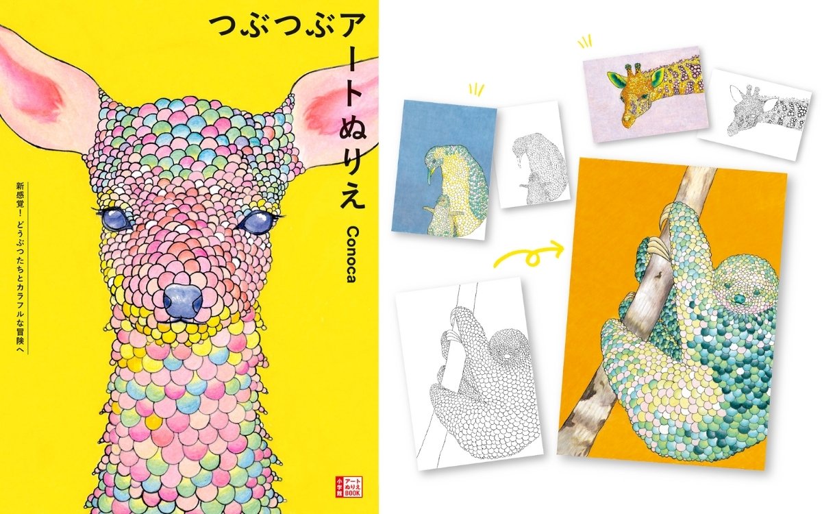 『新感覚!どうぶつたちとカラフルな冒険へ つぶつぶアートぬりえ』(Conoca著 小学館刊 ¥1,540)