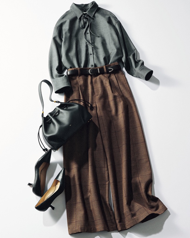 グレー×ブラウンは黒小物で引き締め、ぼんやりを回避。服も仕事もメリハリが大事! 金田さんと話していたら好きな映画が一緒だったことが判明! 「最近ホームプロジェクターにしたのよ。来週見に来ない?」ご自宅訪問できるなんて、うれしい限り! ぜひ行かせてください! ベルト¥39,600(ロンハーマン〈RH ヴィンテージ〉) バッグ¥42,900(アンソロジー〈TOV〉) 靴¥37,400(PIMENTÉ〈FABIO RUSCONI〉)