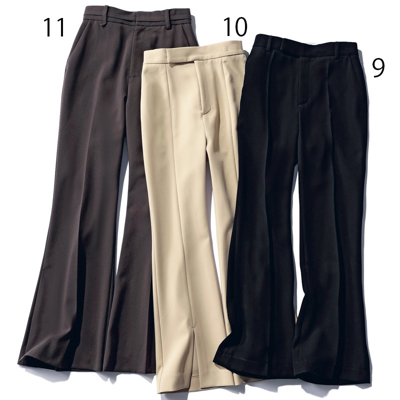 川上:ちなみに、セミフレアパンツを探したかったらánuansがおすすめ! いろんなブランドでセミフレアパンツを探したんだけど、ánuansはすごく充実してた。この3つのパンツは全部ánuansなんだけど、少しずつシルエットが違うの。ブラックのパンツはセンタープレスが入っているきれいめ(9)。ベージュのパンツは、スリットが入っていて、ウエストはゴム仕様(10)。ブラウンのパンツはウエストにデザインがあるから、ベルトなしでも映えるよね(11)。