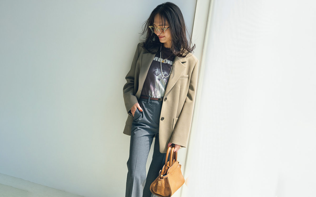パンツ¥41,800(Theory) ジャケット¥17,930(ミラ オーウェン ルミネ新宿2店〈ミラ オーウェン〉) Tシャツ¥22,000(ウィム ガゼット 丸の内店〈ゲミニー〉) バッグ¥90,200(ジャンニ キアリーニ 銀座店〈ジャンニ キアリーニ〉) 靴¥16,500(ル タロン グリーズ ルミネ新宿店〈ル タロン グリーズ〉) ベルト¥12,100(フラッパーズ〈レフィエ〉) メガネ¥67,100(アイヴァン 7285 トウキョウ〈アイヴァン 7285〉) ネックレス[短]¥25,300(マリハ) ネックレス[長]¥29,700(フォーティーン ショールーム〈モニス〉)