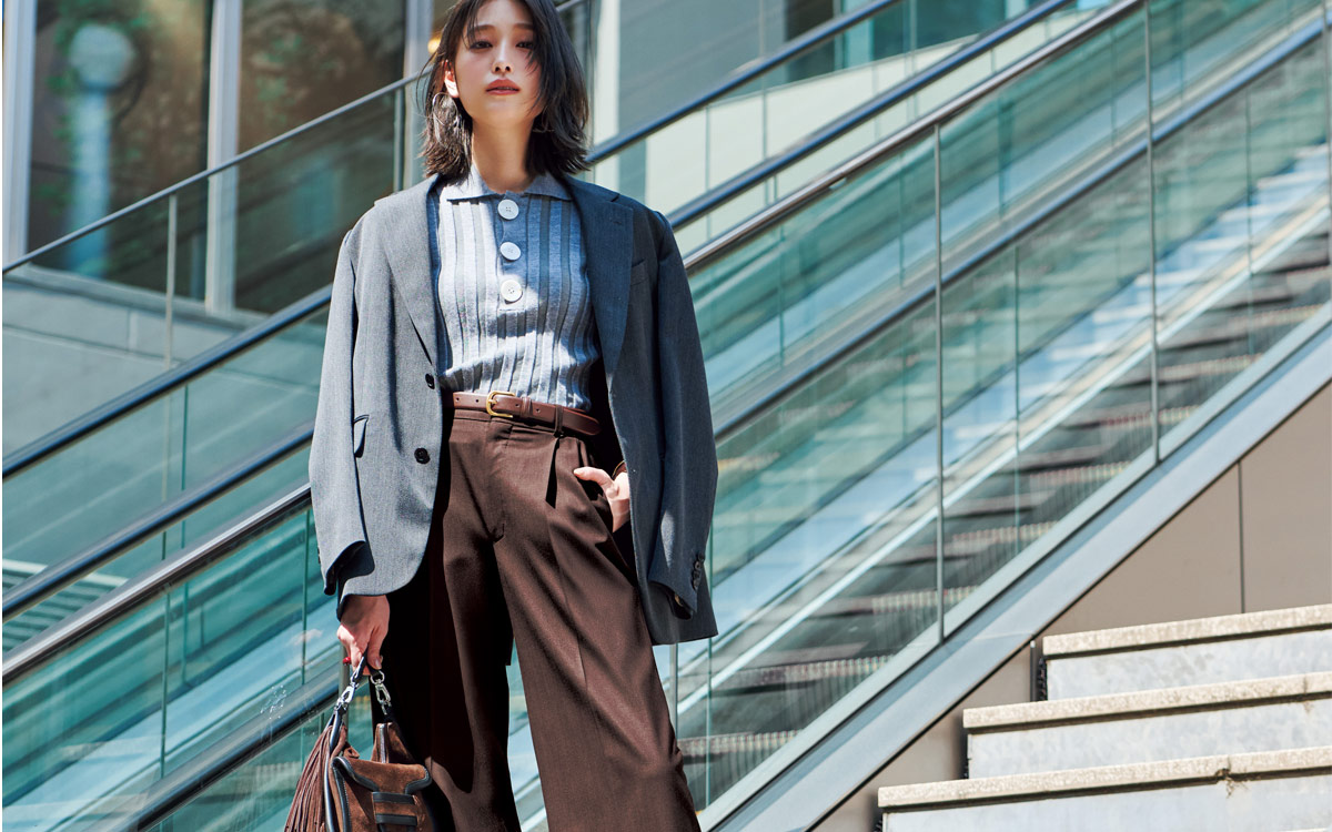 赤みの強いこっくりブラウンのパンツなら、チャコールグレーのジャケットに合わせても真面目すぎない。品のよさとトレンドの程よいMIX感が、スマートな印象につながる。旬ど真ん中のチョコレートブラウンは、この秋冬の大本命。